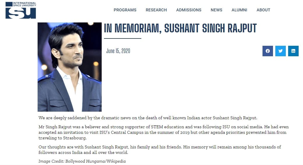 Mr Singh Rajput was a believer and strong supporter of STEM education and was following ISU on social media. https://t.co/E3GZFHdZdo pic.twitter.com/PAqwY5MGoB