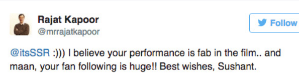 सुशांत ने रजत कपूर को करारा जवाब देते हुए लिखा कि 'मैंने इस फिल्म के लिए कड़ी मेहनत की है जो कि मुआवजे के रूप में है। अगर आप रुचि रखते हैं तो कृपया फिल्म देखिए सर।' सुशांत के जवाब के बाद रजत ने फिर लिखा, 'मुझे आपके परफॉर्मेंस पर भरोसा है जो कि फिल्म में शानदार है। आपकी फैन फॉलोइंग बड़ी है। बहुत शुभकामनाएं, सुशांत।'