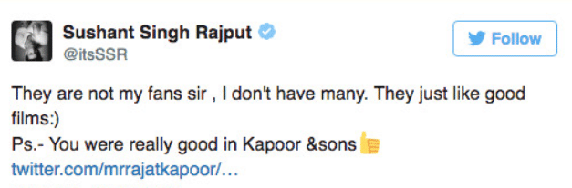 आगे सुशांत लिखते हैं कि 'वो मेरे प्रशंसक नहीं हैं सर। मेरी बहुत ज्यादा फैन फॉलोइंग नहीं है। वो बस अच्छी फिल्म पसंद करते हैं। वैसे आपका काम 'कपूर एंड संस' में काफी अच्छा था।'