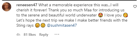 सुष्मिता सेन की इस पोस्ट पर बेटी रेनी सेन ने कमेंट करते हुए लिखा, 'क्या यादगार अनुभव था यह। मैं इसे हमेशा याद रखूंगी! अंडरवाटर की खूबसूरत दुनिया से हमें रूबरू कराने के लिए शुक्रिया मां। आई लव यू।' बता दें कि सुष्मिता सेन के इस वीडियो पर फैंस भी खूब कमेंट कर रहे हैं और उनकी बहादुरी की तारीफ करते नहीं थक रहे। एक यूजर ने लिखा, 'इसे शेयर करने के लिए शुक्रिया।'