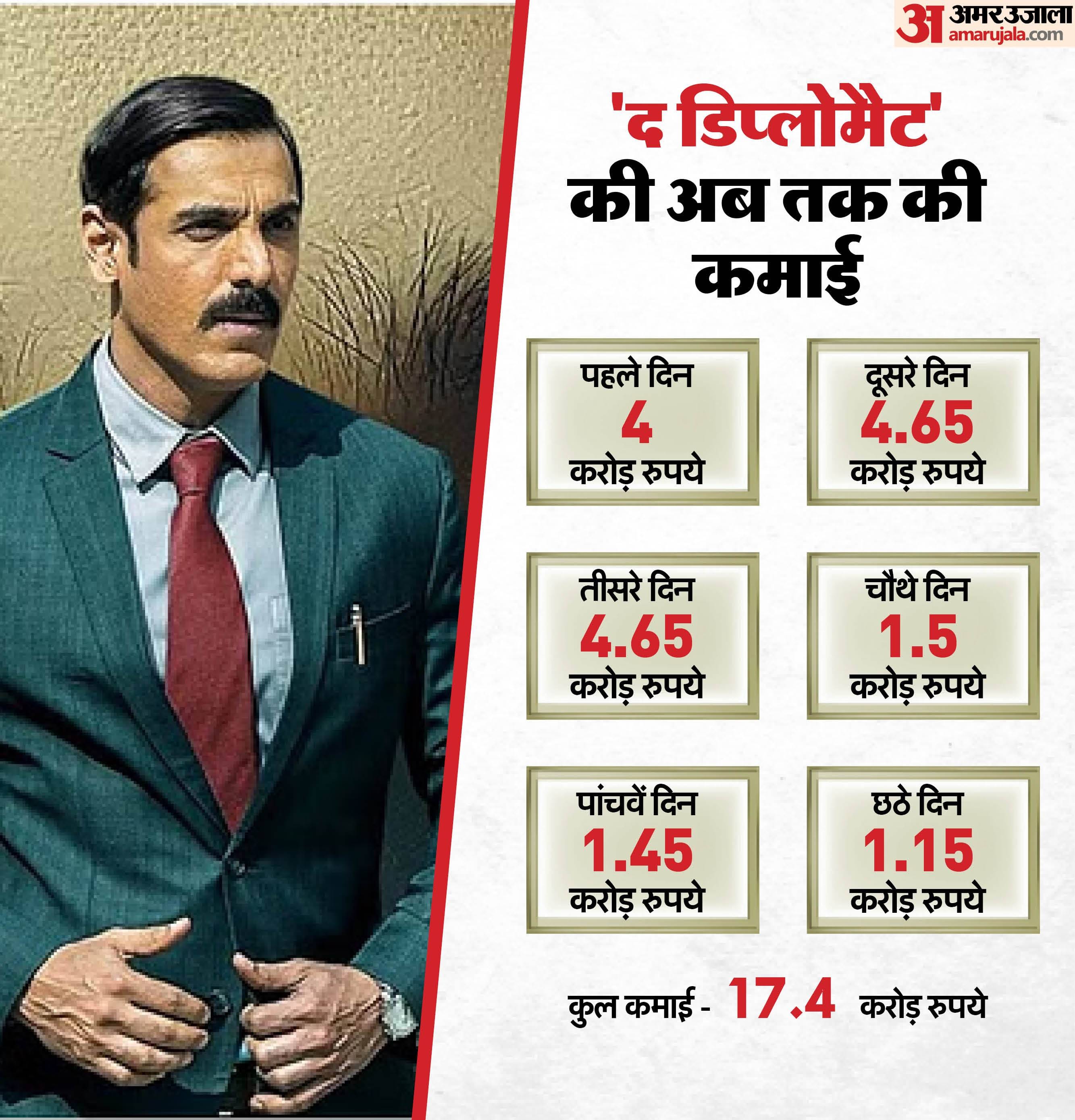 बीते दिन यानी पांचवें दिन फिल्म ने 1.45 करोड़ रुपये का कलेक्शन किया था। वहीं, अब फिल्म का कुल कलेक्शन 17.4 करोड़ रुपये हो चुका है। फिल्म की कहानी एक भारतीय महिला को पाकिस्तान से बाहर निकालने की है। फिल्म में अभिनेता ने राजनयिक जेपी सिंह की भूमिका निभाई है। द डिप्लोमैट की कहानी, पटकथा और संवाद रितेश शाह ने लिखे हैं। फिल्म की सिनेमैटोग्राफी डिमो पोपोव और एमएससी ग्यड ने की है, जबकि संपादन कुणाल वाल्वे ने किया है। रवि श्रीवास्तव प्रोडक्शन डिजाइन की देखरेख की है।