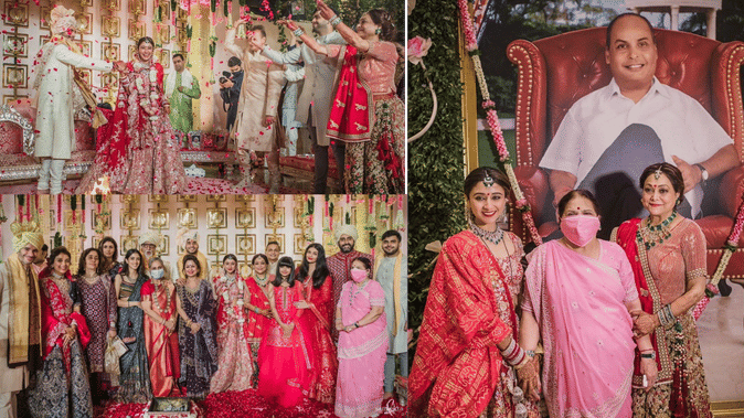 इस तस्वीर में अंबानी परिवार एक साथ पोज देता नजर आ रहा है, सभी बेहद ही खुश दिखाई दे रहे हैं तो वहीं अनमोन अंबानी, कृशा निहारते हुए दिखाई दे रहे हैं। अपनी शादी में कृशा बेहद खूबसूरत लग रही थीं, उन्होंने लाल रंग का हैवी वर्क वाला जरदोजी कढ़ाई का लहंगा पहना था तो वहीं अनमोल अंबानी ने भी सफेद शेरवानी और गुलाबी पगड़ी बांधी थी।