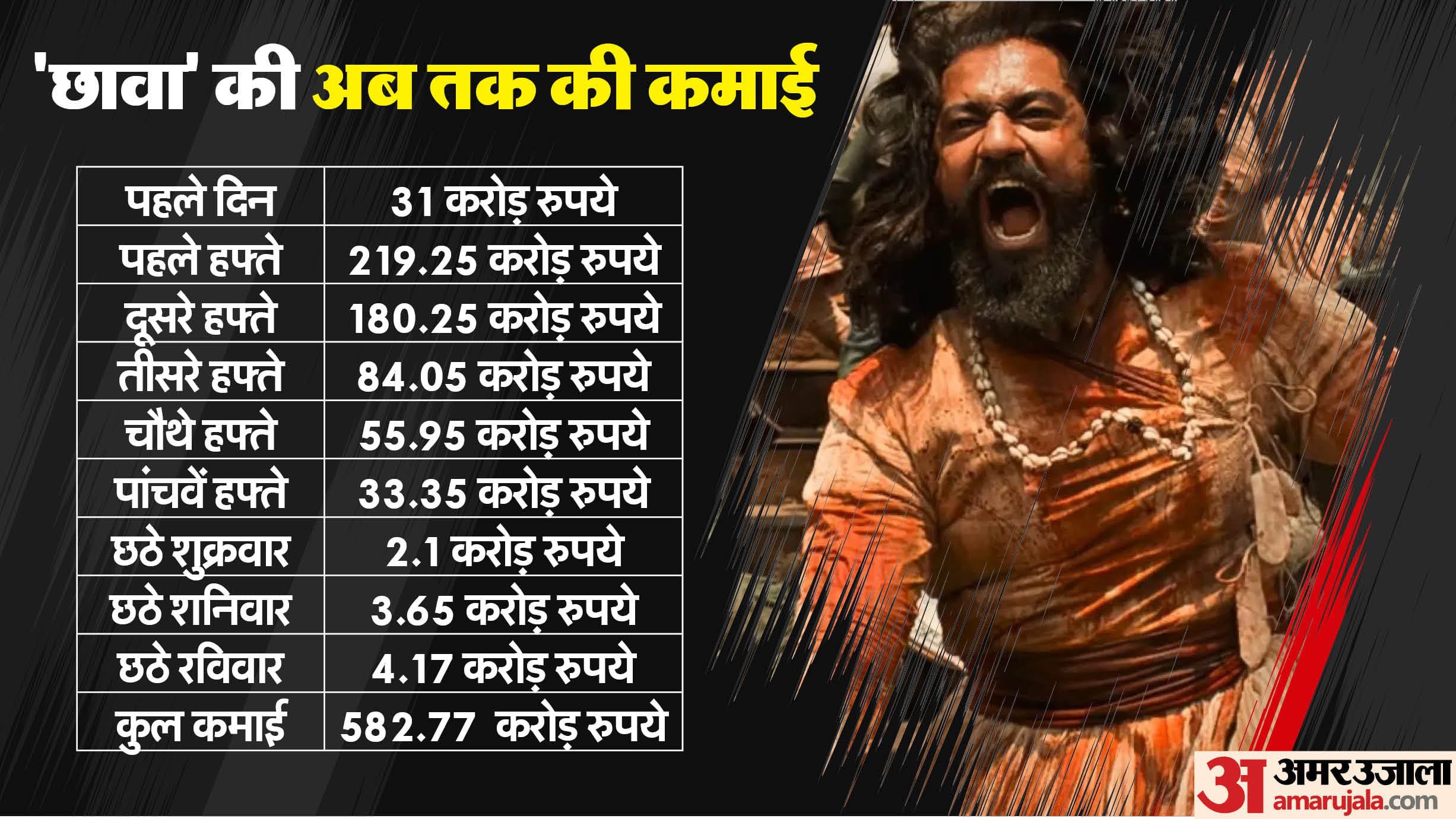 शुरुआती आंकड़ों के अनुसार ‘छावा’ ने 38वें दिन लगभग 4.17 करोड़ रुपये कमा लिए हैं। इस फिल्म ने अब तक कुल 582.77 करोड़ रुपये का कलेक्शन किया है। रविवार होने के कारण दर्शक फिल्म को देखने थिएटर तक आए हैं, इसलिए फिल्म के कलेक्शन में इजाफा देखा गया है। जबकि पिछले दिनों इसकी कमाई में थोड़ी गिरावट नजर आने लगी थी।