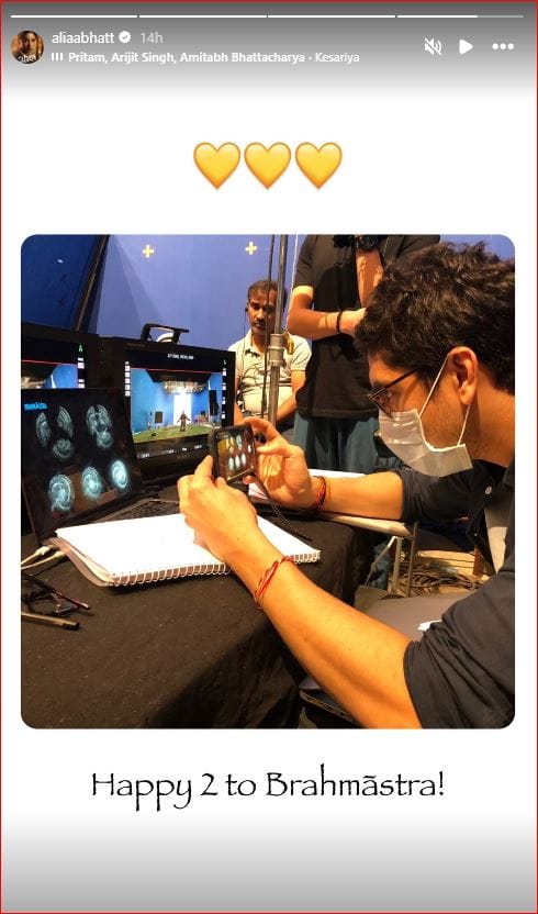 आलिया ने अपने सोशल मीडिया अकाउंट इंस्टाग्राम की स्टोरी पर कई तस्वीरें जिगरा को लेकर साझा कीं, लेकिन एक तस्वीर पर सभी की निगाहें जाकर थम गईं। इस तस्वीर में अयान मुखर्जी नजर आ रहे हैं और जिसमें वह कुछ ग्रॉफिक्स पर काम करते दिखाई दे रहे हैं। इस तस्वीर को आलिया ने इंस्टा स्टोरी पर साझा किया और लिखा, हैप्पी 2 'ब्रह्मास्त्र'। इसके साथ ही आलिया ने तीन पीले रंग के हार्ट इमेजी भी बनाए। 9 सिंतबर 2022 को आलिया और रणबीर की फिल्म 'ब्रह्मास्त्र' रिलीज हुए दो साल पूरे हो चुके हैं। इसी मौके पर आलिया ने 'ब्रह्मास्त्र' को लेकर यह जानकारी साझा की है।