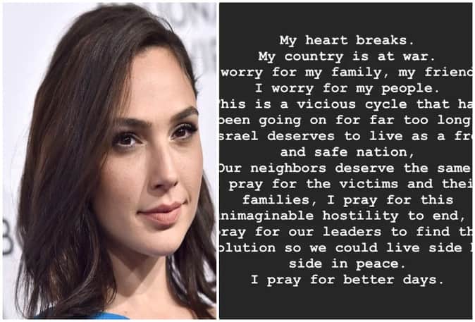 दरअसल, गैल गैडोट ने एक ट्वीट के माध्यम से अपनी चिंता जाहिर की है और अपने देश में शांति की कामना की है। उन्होंने ट्वीट कर लिखा कि 'मैं बहुत दुखी हूं। यह एक दुष्चक्र है जो बहुत लंबे समय से चला आ रहा है। इस्रायल को एक स्वतंत्र और सुरक्षित राष्ट्र के रूप में जीने का पूरा हक है। हमारे पड़ोसियों को भी यह अधिकार है। मैं पीड़ितों और उनके परिवारों के लिए प्रार्थना करती हूं। मैं इस अकल्पनीय शत्रुता को खत्म करने की प्रार्थना करते हुए अपने नेताओं से इस समस्या का समाधान ढूंढने का निवेदन करती हूं। ताकि हम कंधे से कंधा मिलाकर शांति से रह सकें।'