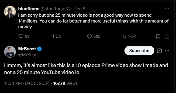 मिस्टर बीस्ट के फैंस को जब पता चला कि उन्होंने करोड़ों खर्च करके एक मिनी शहर बसाया है तो कुछ लोगों ने इस पर सवाल भी किए। एक यूजर ने लिखा, '25 मिनट के एक वीडियो के लिए इतनी रकम खर्च करना मेरे ख्याल से अच्छा आइडिया नहीं। इससे कुछ और बेहतर हो सकता था'। इस पर मिस्टर बीस्ट ने स्पष्ट किया कि यह मिनी सिटी 25 मिनट के वीडियो के लिए नहीं है, बल्कि बिल्कुल अलग शो के लिए है, जिसके बाकायदा 10 एपिसोड प्राइम वीडियो पर आने हैं।