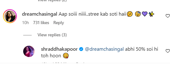 वहीं एक अन्य यूजर ने श्रद्धा कपूर से पूछा, 'आप सोई नहीं..., स्त्री कब सोती है?' इसका जवाब देते हुए श्रद्धा ने लिखा, 'अभी 50 प्रतिशत सोई हुई ही तो हूं'। श्रद्धा कपूर ने अपना यह पोस्ट कल शुक्रवार देर रात पोस्ट किया। इस पर ढेर सारे कमेंट आ रहे हैं। एक यूजर ने लिखा, 'ब्लॉकबस्टर स्त्री'। एक अन्य यूजर ने लिखा, 'लीजेंड छह साल बाद रिपीट होते हैं'। एक यूजर ने लिखा, 'हमें अपनी स्त्री पर गर्व है'।