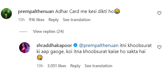 इन पर यूजर्स के कमेंट आ रहे हैं। एक तरफ शानदार अभिनय के लिए लोग श्रद्धा की तारीफ कर रहे हैं, तो वहीं सवाल भी पूछ रहे हैं, जिनका श्रद्धा ने भी जवाब दिया है। एक यूजर ने पूछा आप आधार कार्ड में कैसी नजर आती हैं? इसका श्रद्धा ने दिलचस्प जवाब दिया और लिखा, 'इतनी खूबसूरत कि आप कहोगे कि कोई इतना खूबसूरत कैसे हो सकता है'। इसके साथ उन्होंने फनी इमोजी भी बनाया।