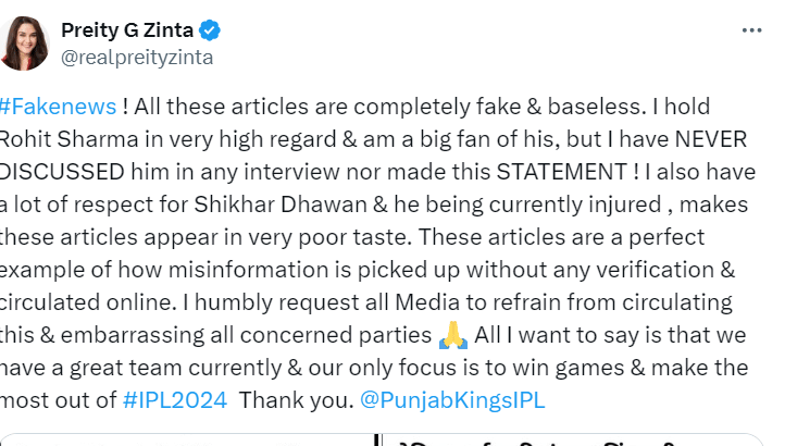 प्रीति जिंटा ने आगे लिखा है, 'मैं रोहित शर्मा का बेहद सम्मान करती हूं और मैं उनकी बहुत बड़ी प्रशंसक भी हूं। लेकिन, मैंने ऐसा कोई इंटरव्यू नहीं दिया। इस तरह का बयान भी कभी नहीं दिया। मैं शिखर धवन का बहुत सम्मान करती हूं। फिलहाल वह चोटिल हैं और ऐसे वक्त में इस तरह के आर्टिकल्स का आना बहुत खराब है। यह आर्टिकल गलत सूचनाओं का उदाहरण हैं, जिन्हें बिना किसी तथ्य के जाने चलाया गया और सोशल मीडिया पर वायरल हो रहे हैं।