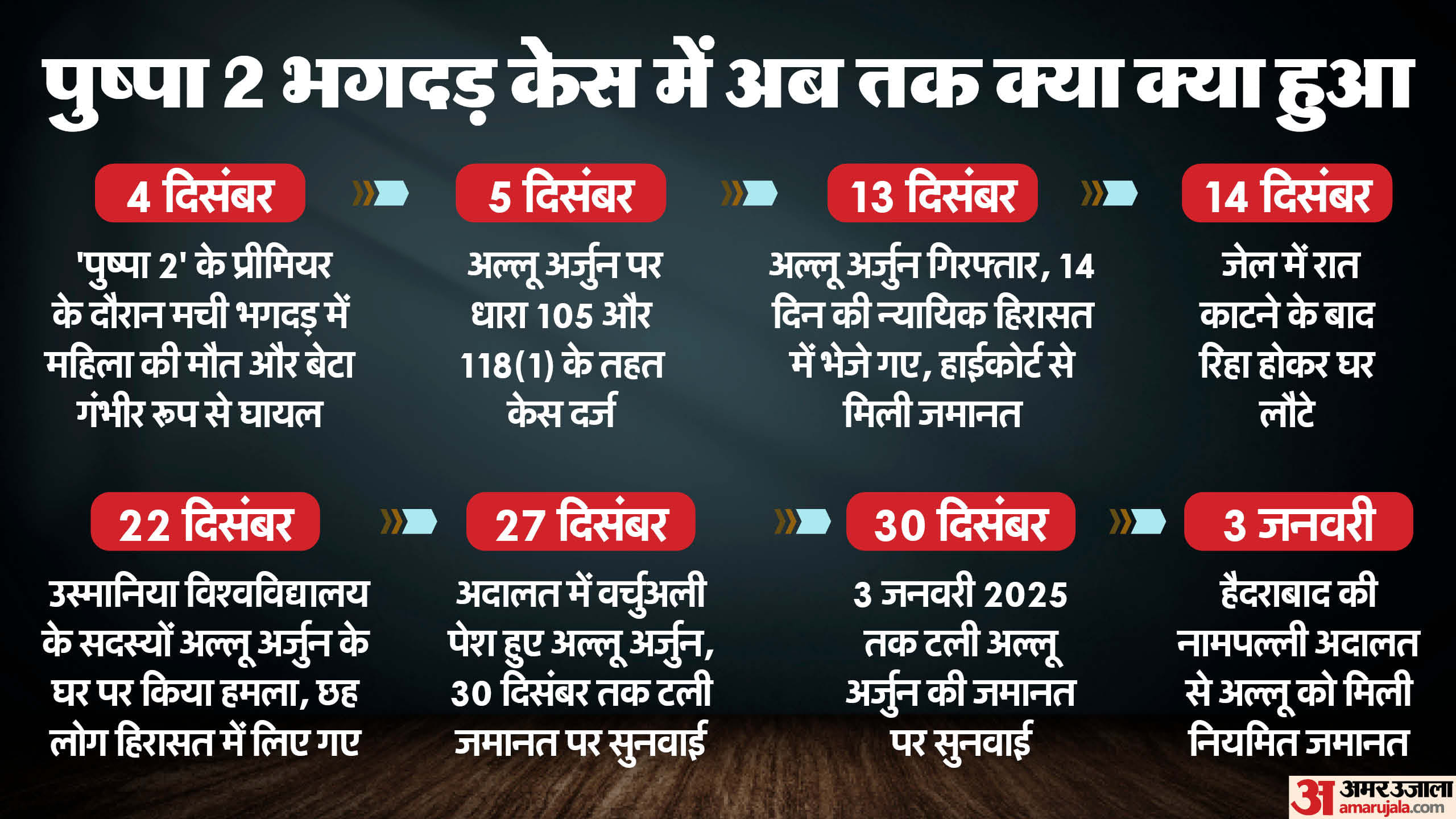 कुछ दिन पहले अल्लू अर्जुन अपने अपनी टीम और थिएटर प्रबंधन के खिलाफ दर्ज संध्या थिएटर भगदड़ मामले में अदालत के समक्ष वर्चुअली पेश हुए थे। 27 दिसंबर को 14 दिन की न्यायिक हिरासत अवधि समाप्त होने के बाद अभिनेता को आगे की कार्यवाही के लिए अदालत के समक्ष पेश होना पड़ा। 31 दिसंबर को नामपल्ली जिला न्यायालय में उनकी जमानत याचिका पर सुनवाई होनी थी, लेकिन 3 जनवरी तक सुनवाई स्थगित कर दी गई थी। वहीं, आज आखिरकार अदालत से अल्लू अर्जुन को नियमित जमानत मिल गई है।