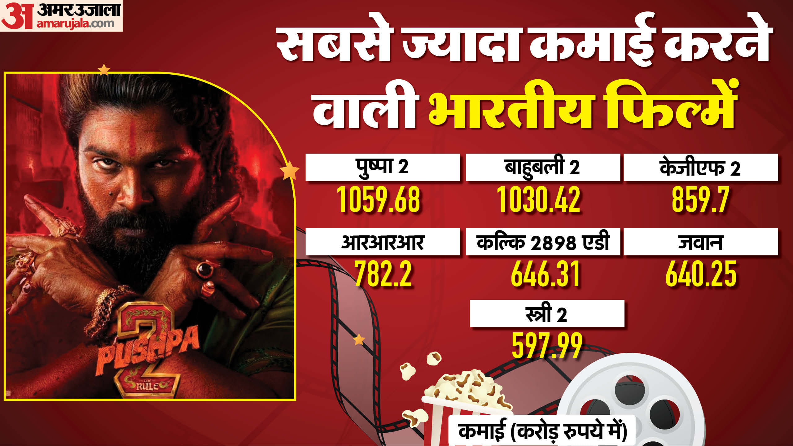 वहीं, फिल्म की कुल कमाई की बात करें तो पुष्पा 2 का कुल कलेक्शन 1059.68 करोड़ रुपये हो चुका है और इसके साथ ही यह सबसे ज्यादा कमाई करने वाली भारतीय फिल्म बन गई है। इसने 'बाहुबली 2' के भारतीय बॉक्स ऑफिस के कलेक्शन को पीछे छोड़ दिया और पहला स्थान हासिल कर लिया। अब तक 'बाहुबली 2' 1030.42 करोड़ रुपये के कलेक्शन के साथ पहले स्थान पर थी। चलिए अब तक की सबसे ज्यादा कमाई करने वाली भारतीय फिल्मों के बारे में जानते हैं...