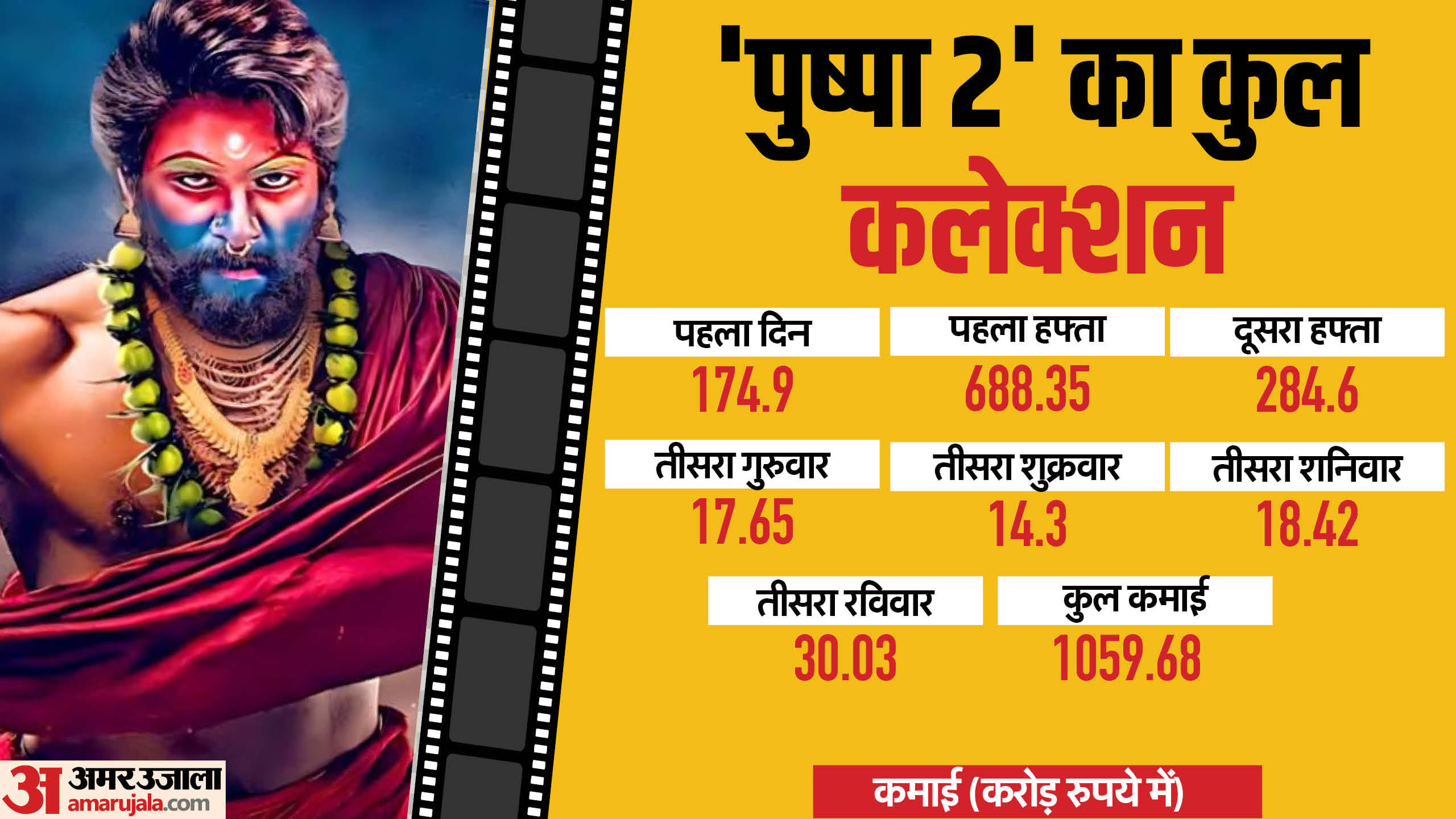 आज तीसरे रविवार को 'पुष्पा 2 द रूल' की कमाई में जबरदस्त उछाल देखा गया। शुरुआती आंकड़ों के अनुसार, पुष्पा 2 ने 18वें दिन 30.03 करोड़ रुपये की कमाई की। बीते दिन फिल्म ने 24.75 करोड़ रुपये की कमाई की थी। आज फिल्म के कलेक्शन में 21 प्रतिशत से ज्यादा का उछाल आया। तीसरे रविवार को इतनी मजबूत कमाई करना किसी फिल्म के लिए आसान बात नहीं है। चलिए फिल्म की अब तक की कमाई पर एक नजर डालते हैं...