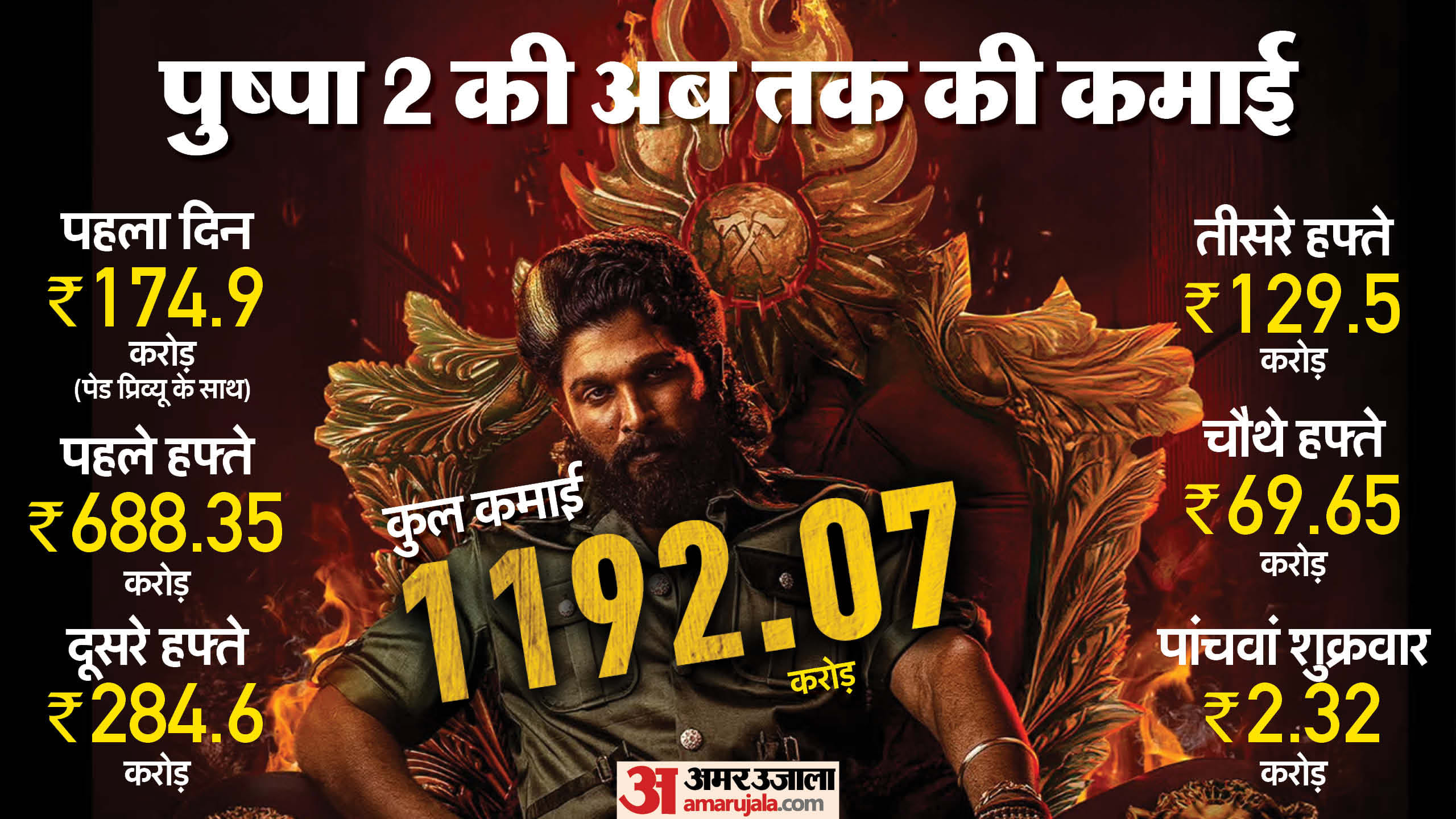 वहीं, फिल्म की कुल कमाई की बात करें तो अब तक पुष्पा 2 बॉक्स ऑफिस पर 1192.07 करोड़ रुपये का कलेक्शन कर चुकी है। पांचवें हफ्ते में ज्यादादर फिल्में सिनेमाघरों से भी उतर जाती है, लेकिन पुष्पा 2 इतनी मजबूती के साथ कदम जमाए हुए है कि इसकी कमाई अभी लाखों में भी नहीं सिमटी है। इस रफ्तार के साथ कुछ दिनों में यह फिल्म 1200 करोड़ रुपये के क्लब में भी शामिल हो जाएगी।