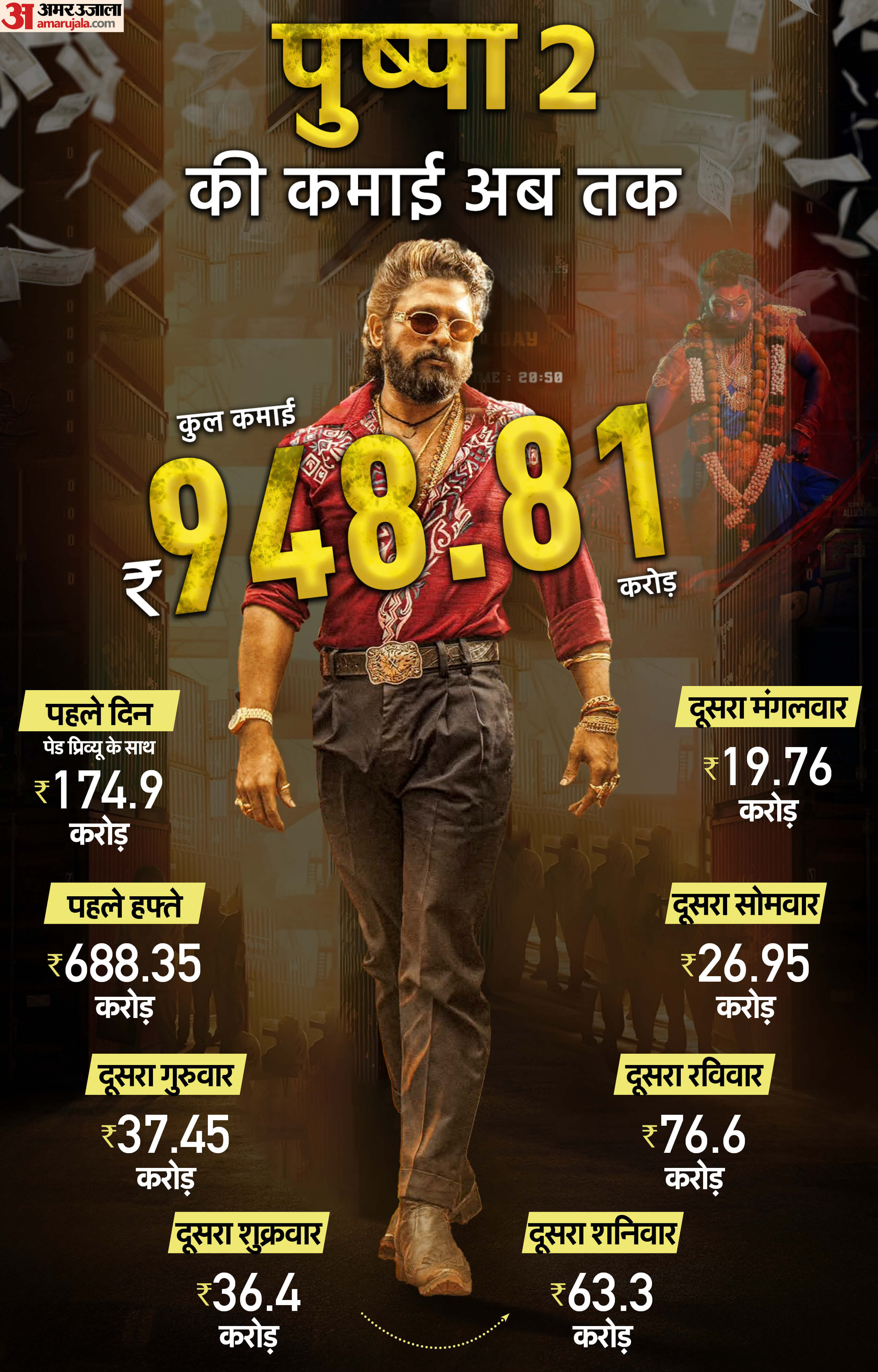 पुष्पा 2 की कमाई की रफ्तार देखते हुए ऐसा लग रहा है कि आने वाले दो दिनों के अंदर ही भारतीय बॉक्स ऑफिस पर यह फिल्म 1000 करोड़ रुपये के क्लब में शामिल हो जाएगी। बुधवार की कमाई के साथ फिल्म बॉक्स ऑफिस पर दो हफ्ते पूरे कर लेगी। वहीं, वीकएंड की कमाई की बात करें तो शनिवार को फिल्म ने 63.3 करोड़ रुपये कमाए थे। वहीं, रविवार को इसकी कमाई 76.6 करोड़ रुपये हुई थी।