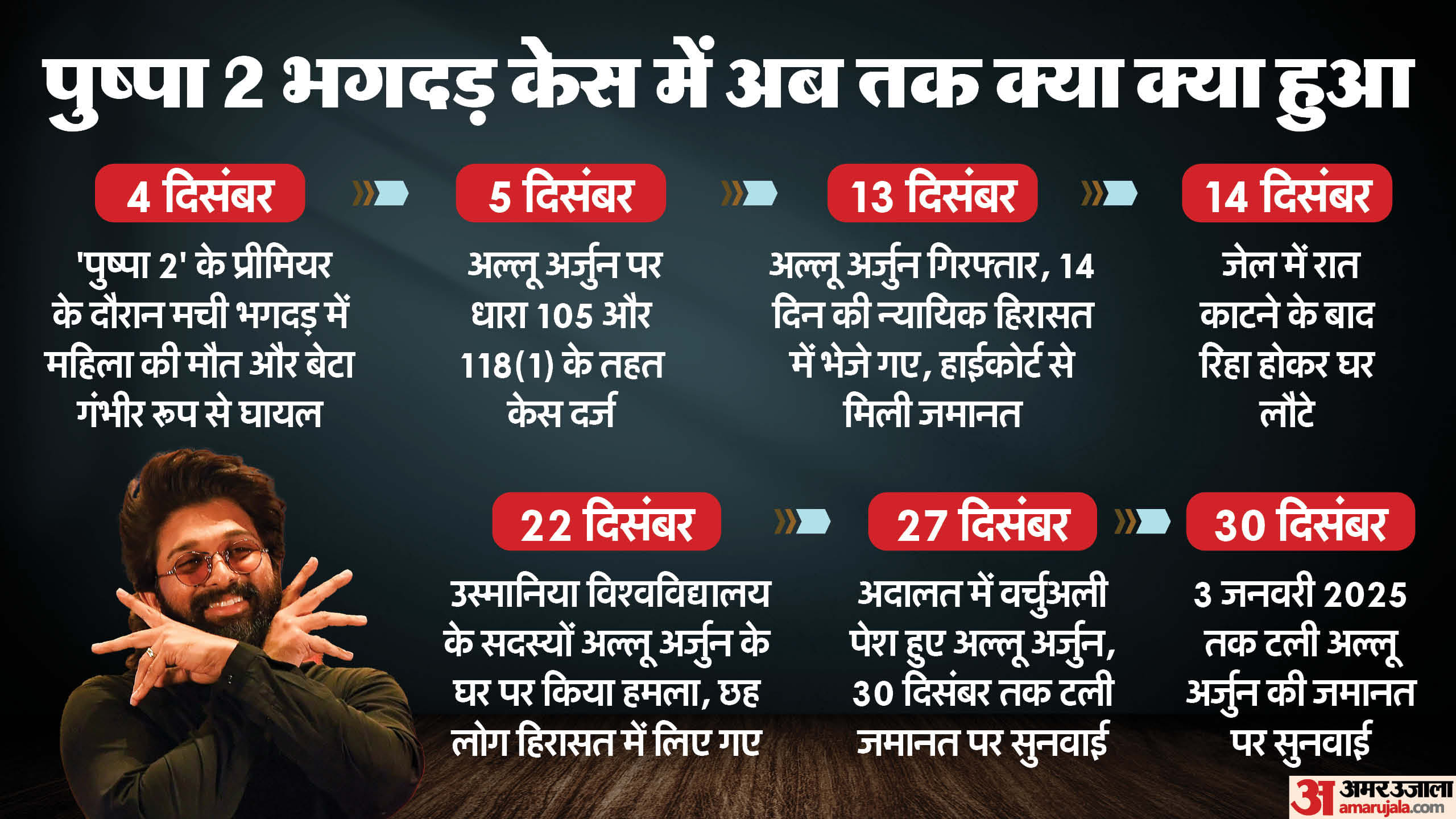 कुछ दिन पहले अल्लू अर्जुन अपने अपनी टीम और थिएटर प्रबंधन के खिलाफ दर्ज संध्या थिएटर भगदड़ मामले में अदालत के समक्ष वर्चुअली पेश हुए थे। 27 दिसंबर को 14 दिन की न्यायिक हिरासत अवधि समाप्त होने के बाद अभिनेता को आगे की कार्यवाही के लिए अदालत के समक्ष पेश होना पड़ा।