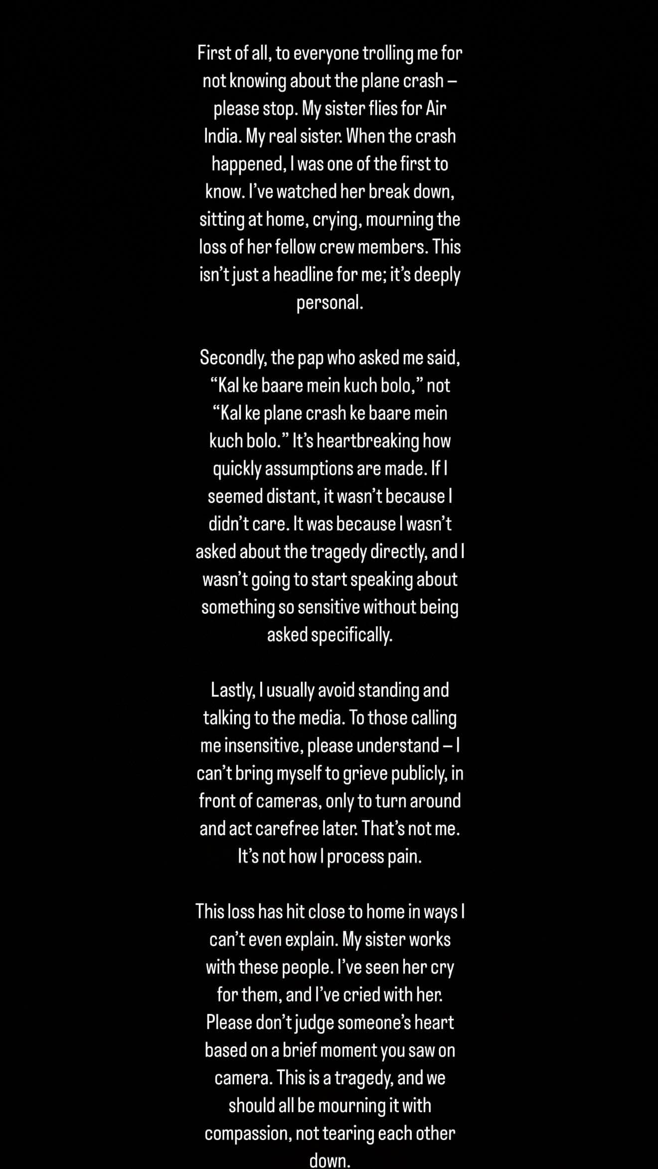 उन्होंने आगे कहा 'पैपराजी ने मुझसे कहा कि कल के बारे में कुछ बोलो। उन लोगों ने खास तौर से विमान दुर्घटना के बारे में नहीं पूछा। यह बहुत दुखद है कि कितनी जल्दी धारणाएं बना ली जाती हैं। अगर मैंने इस बारे कोई बात नहीं कही, तो ऐसा इसलिए नहीं था कि मुझे परवाह नहीं थी। ऐसा इसलिए था क्योंकि मुझसे सीधे तौर पर विमान दुर्घटना के बारे में नहीं पूछा गया था। मैं बिना पूछे किसी संवेदनशील विषय पर बात नहीं करना चाहती थी।'