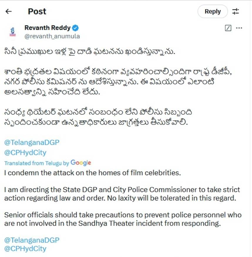 सीएम रेवंत रेड्डी ने एक्स पर लिखा, 'मैं फिल्मी हस्तियों के घरों पर हमले की निंदा करता हूं। मैं राज्य के डीजीपी और शहर के पुलिस आयुक्त को कानून-व्यवस्था के मामले में सख्त कार्रवाई करने का आदेश देता हूं। इस मामले में कोई ढिलाई बर्दाश्त नहीं की जाएगी।' उन्होंने आगे कहा, 'वरिष्ठ अधिकारियों को यह सुनिश्चित करने के लिए सावधानी बरतनी चाहिए कि संध्या थिएटर की घटना में शामिल नहीं होने वाले पुलिसकर्मी प्रतिक्रिया न दें।'