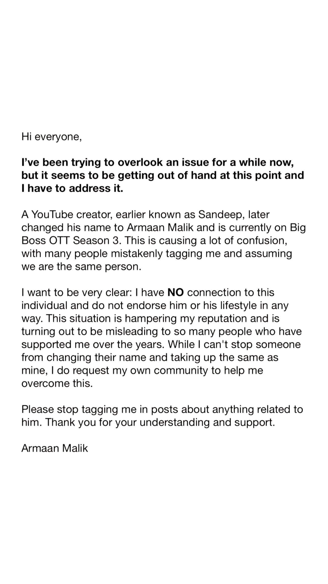 उन्होंने नोट में लिखा, 'एक यूट्यूब निर्माता, जिसे पहले संदीप के नाम से जाना जाता था, उन्होंने बाद में अपना नाम बदलकर अरमान मलिक रख लिया और वर्तमान में बिग बॉस ओटीटी सीजन 3 में हैं। इससे बहुत भ्रम पैदा हो रहा है। कई लोग गलती से मुझे टैग कर रहे हैं और मान रहे हैं कि हम एक ही व्यक्ति हैं।'