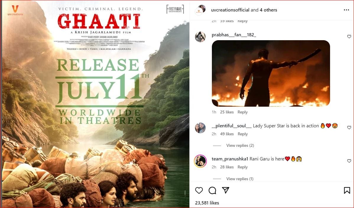 फिल्म निर्माताओं ने आज इंस्टाग्राम पर फिल्म 'Ghaati' के नए पोस्टर के साथ इसकी नई रिलीज डेट से भी पर्दा उठा दिया है। उन्होंने कैप्शन में लिखा, ''अपना सिंहासन हासिल करने और बॉक्स ऑफिस पर विजय पाने के लिए आ रही है। #Ghaati 11 जुलाई को दुनिया भर में भव्य रिलीज #GhaatiFromJuly11th'