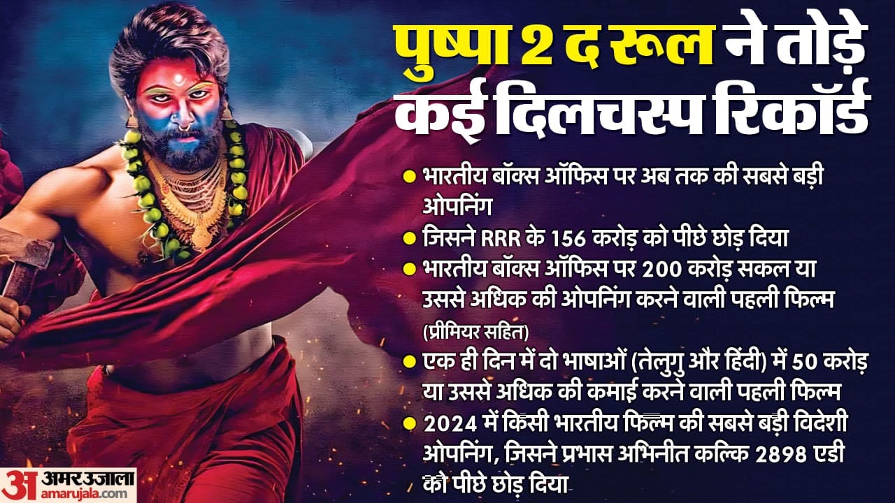 मीडिया रिपोर्ट्स के अनुसार, अल्लु अर्जुन की 'पुष्पा 2: द रूल' ने तेलुगु बॉक्स ऑफिस 95.1 करोड़ रुपए का कलेक्शन किया, जबकि हिंदी में फिल्म ने 67 करोड़ रुपए कमाए। 'पुष्पा 2' पहली ऐसी भारतीय फिल्म बनी है, जिसने ओपनिंग डे पर दो भाषाओं में 50 करोड़ रुपए से ज्यादा कलेक्शन किया है। वहीं 'पुष्पा 2: द रूल' ने तमिलनाडु में 7 करोड़ रुपए और कर्नाटक में 1 करोड़ और केरल में 5 करोड़ रुपए का कलेक्शन किया है। दुनिया भर के बॉक्स ऑफिस पर किसी भारतीय फिल्म की सबसे बड़ी ओपनिंग, जिसने एसएस राजामौली के निर्देशन में बनी आरआरआर के अलावा भी कई रिकॉर्ड तोड़ दिए हैं।