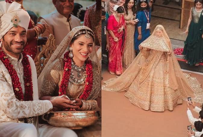 अंकिता लोखंडे ने अपनी शादी में ऑल-गोल्डन लुक अपनाया। एक्ट्रेस ने गोल्डन कलर का खूबसूरत लहंगा पहना था, जिसके साथ एक्ट्रेस ने डबल चुन्नी पेयर की थी। इस खूबसूत लहंगे के साथ अंकिता ने व्हाइट कलर का चूड़ा पहना था, जो उनके लुक को चार-चांद लगा रहा था। वहीं, विक्की जैन भी अपनी दुल्हन के साथ ट्विनिंग करते दिखाई दिए। विक्की ने भी गोल्डन और व्हाइट कलर की शेरवानी पहनी थी, जिसके साथ उन्होंने व्हाइट पगड़ी पेयर की थी। इस आउटफिट को मनीष मल्होत्रा ने डिजाइन किया है, जिसकी जानकारी अंकिता ने अपने कैप्शन में दी है।