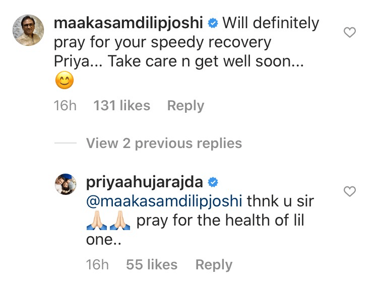 प्रिया आहूजा के कोविड 19 पॉजिटिव होने की खबर मिलते ही ‘तारक मेहता का उल्टा चश्मा’ में जेठालाल का किरदार करने वाले दिलीप जोशी ने उनके जल्द ठीक होने की कामना की। दिलीप जोशी ने लिखा- ‘हम तुम्हारे जल्द ठीक होने की दुआ करते हैं। ध्यान रखो और जल्दी ठीक हो जाओ।‘ इसके अलावा प्रिया के प्रशंसक उनके ठीक होने की प्रार्थना कर रहे हैं।