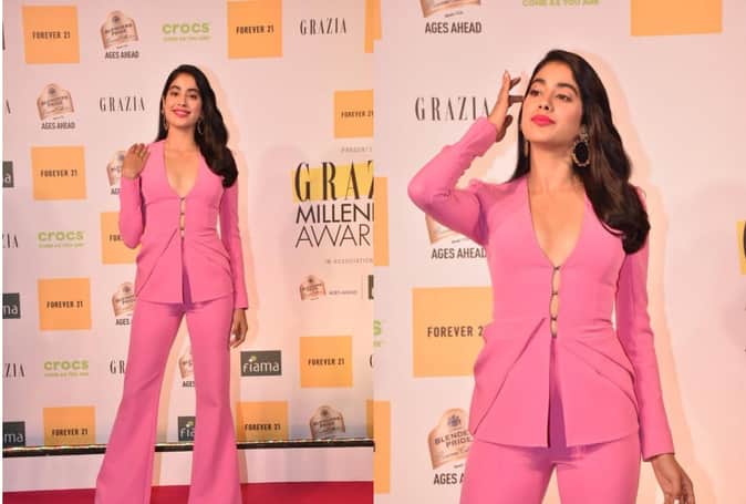 जाह्नवी कपूर ने पिंक कलर का पैंटसूट पहना था। जाह्नवी का यह पैंटसूट शर्टलैस था और ब्लेजर की प्लंजिंग नेकलाइन उन्हें हॉट लुक दे रही थी। अपने इस लुक को पूरा करने के लिए जाह्नवी ने बोल्ड पिंक लिपस्टिक के साथ बालों को ओपन कर रखा था।