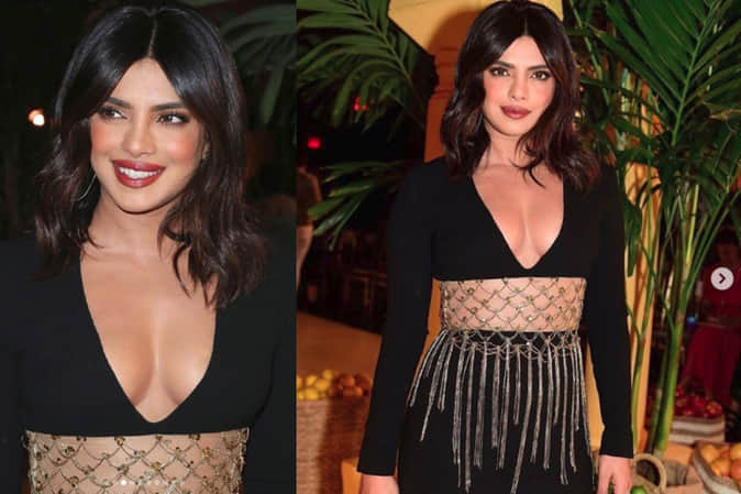 प्लंजिंग नेकलाइन, फुल स्लीव्स काफ लेंथ ड्रेस की डिजाइनिंग थोड़ी खास है। क्रॉप टॉप को शिमर, टैसल और बीड्स के साथ मिडरिफ के पास कटआउट डिजाइन किया गया है, जो प्रियंका के कर्व्स को हाइलाइट कर रहा था।।