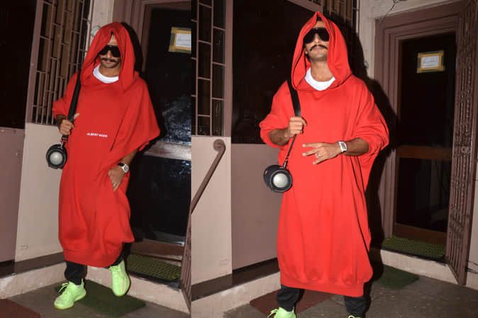 रणवीर सिंह को हाल ही में एक डबिंग स्टूडियो के बाहर स्पॉट किया गया। इस बार भी रणवीर उसी अतरंगी अंदाज में दिखे जैसे वो हमेशा नजर आते हैं। लॉन्ग रेड हुडी पहने रणवीर 'लाल परी' लग रहे थे।