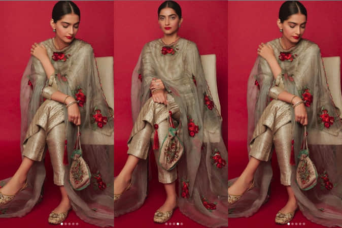 ट्रेडिशनल सलवार-सूट पहने सोनम से नजरें हटाना मुश्किल है क्योंकि उनके कपड़े से लेकर मेकअप और हेयर सबकुछ परफेक्ट है। गोल्डन और ग्रे मिक्स रंग के सलवार-सूट के साथ जरी के दुपट्टे पर लाल गुलाब की एम्ब्रॉइडरी का गजब काम किया गया है।