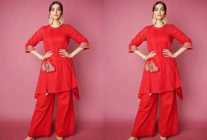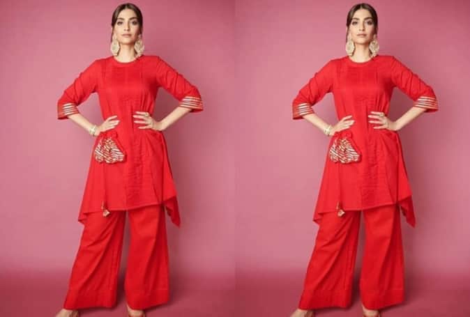ऑल रेड लुक में नजर आईं सोनम कपूर, कानों में पहनी गोल्ड चांद बाली लग रही कमाल