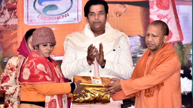 मंच से ही यूनिफॉर्म, लंच बॉक्स वितरित करते मुख्यमंत्री योगी आदित्यनाथ