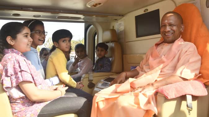 तस्वीरें: सीएम योगी संग हेलीकॉप्टर में बैठकर गदगद हुए बच्चे, चॉकलेट देकर दुलारा