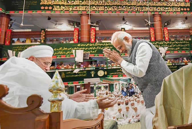 इंदौर की सैफी मस्जिद में मोदी की संगत से कई गौर करने वाली तस्वीरें आईं। धर्मगुरु सैयदना आलीकदर मुफद्दल सैफुद्दीन से पीएम मोदी की बार-बार होती गुफ्तगू, पीएम के अभिवादन का अंदाज सब कुछ दिल जीतने की कोशिश जैसा था। पीएम मोदी को शॉल ओढ़ाकर सम्मानित किया गया। बाकी भेंट भी मोदी ने माथे से लगाकर स्वीकार किया।