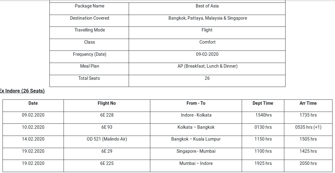 10 रातें और 11 दिन की यह यात्रा नौ फरवरी को मध्य प्रदेश के इंंदौर से शुरू होगी। इसके तहत बैंकॉक और पटाया में दो रातें, सिंगापुर में दो रातें और मलेशिया में तीन रातें बिता पाएंगे। इन चारों जगहों पर घूमने लायक इतने पर्यटन स्थल हैं कि आपकी यह विदेश यात्रा यादगार रह जाएगी। पैकेज के बारे में अन्य जानकारी के लिए नीचे देखें: