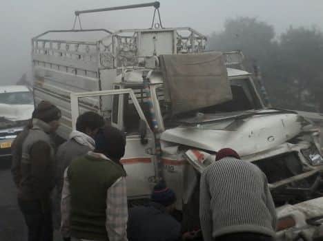 सड़क पर खड़े एक ट्रक से कई गाड़ियां भिड़ गईं। ये ट्रक सड़क पर खराब खड़ा था। कोहरे के चलते गाड़ियों को ये ट्रक दिखाई नहीं दिया जिससे ये हादसा हुआ।