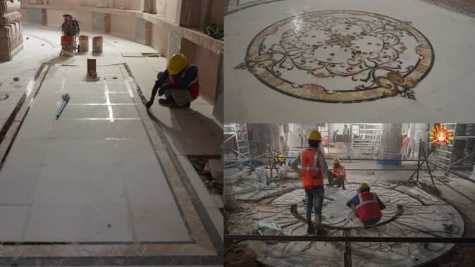 श्रीराम जन्मभूमि तीर्थ क्षेत्र ट्रस्ट ने शनिवार को एक्स पर तस्वीरें जारी की हैं जिसमें कारीगर फर्श को सजाने संवारने काम करते हुए नजर आ रहे हैं।