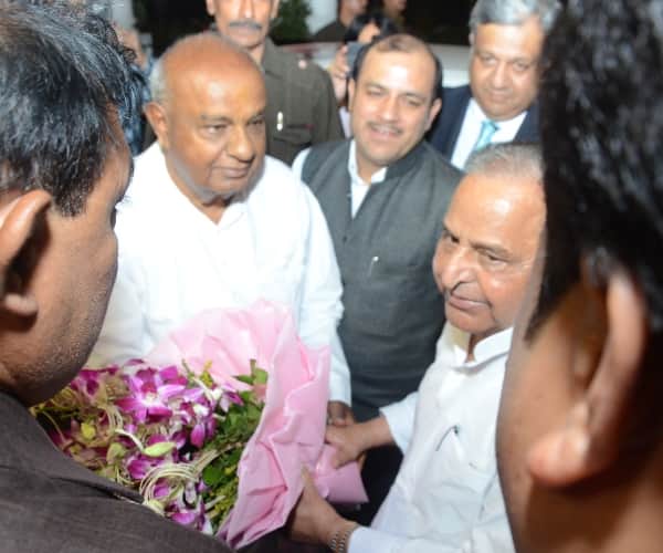 समाजवादी पार्टी के रजत जयंती समारोह में शामिल होने के लिए सियासी दिग्गजों का देर रात तक आना जारी रहा। पूर्व प्रधानमंत्री एच डी देवगौड़ा जब लखनऊ पहुंचे तो सपा सुप्रीमो मुलायम ने उन्हें रिसीव किया और उनका जोरदार स्वागत किया।