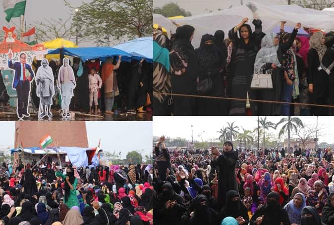 नागरिकता संशोधन कानून, एनआरसी और एनपीआर के विरोध में चल रहे प्रदर्शन के 50 दिन पूरे होने पर शुक्रवार को ऐतिहासिक घंटाघर पर महिलाओं का हुजूम उमड़ पड़ा। बारिश व तेज हवाएं महिलाओं के हौसले कम नहीं कर सकीं। महिलाएं तिरपाल ओढ़ कर प्रदर्शन में डटी रहीं।