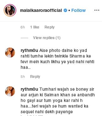 दरअसल मलाइका के इंस्टाग्राम पोस्ट पर कुछ यूजर्स ने बॉडी शेमिंग के कमेंट्स किए हैं। इसके साथ ही कुछ यूजर्स ने अर्जुन कपूर से जुड़े कमेंट्स भी किए। एक यूजर ने लिखा कि तुम्हारी वजह से अर्जुन कपूर- बोनी कपूर की सलमान खान से अनबन हो गई है। अब हम वांटेड का सीक्वल नहीं देख पाएंगे।