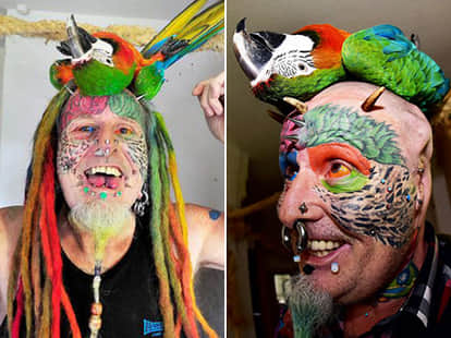यही नहीं, इस आदमी ने पूरे शरीर में 110 टैटू बनवाएं हैं, 50 जगह अंगच्छेद करवाए हैं और जीब को भी दो हिस्सों में बांट लिया है। चेहरे और आंखों की पुतली तक पर तोते के लिए इनका लगाव छलकता दिख रहा।