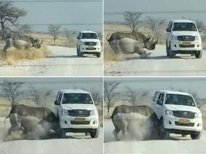 देखिए क्या होता है जब डेढ़ हजार किलो के गैंडे का गुस्सा फूटता है और वो अपने आगे फिर किसी को नहीं देखता। कुछ भी पलटने की क्षमता रखता है।