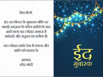 प्रधानमंत्री ने हिंदी और अंग्रेजी में लिखे दो ग्रीटिंग्स शेयर किए हैं और लिखा है- ईद के पावन पर्व पर बधाई।