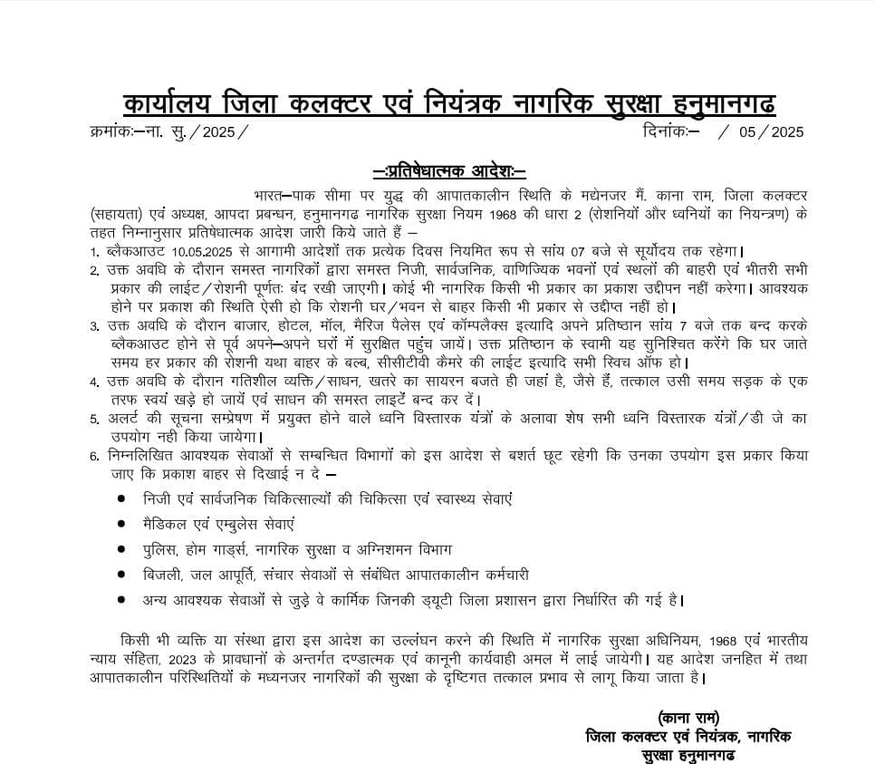 India-Pak Tension: हनुमानगढ़ में अनिवार्य ब्लैकआउट लागू, हर रात 7 बजे से सुबह तक बंद रहेंगे सभी लाइट स्रोत