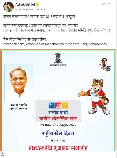 ग्रामीण ओलंपिक की शुरुआत 29 अगस्त से हो रही है और यह पांच अक्टूबर तक चलेगा। सोमवार से एक सितंबर तक ग्राम पंचायत स्तर पर खेलों का आयोजन होगा। इसी तरह से 12 से 15 सितंबर तक ब्लॉक स्तर पर, 22 से 25 सितंबर तक जिला और राज्य स्तर पर 2 से 5 अक्टूबर तक आयोजन होगा। खेल विभाग, ग्रामीण विकास एवं पंचायतीराज विभाग, शिक्षा विभाग, स्वास्थ्य विभाग और स्थानीय प्रशासन की साझेदारी से ग्रामीण ओलंपिक का आयोजन जाएगा।