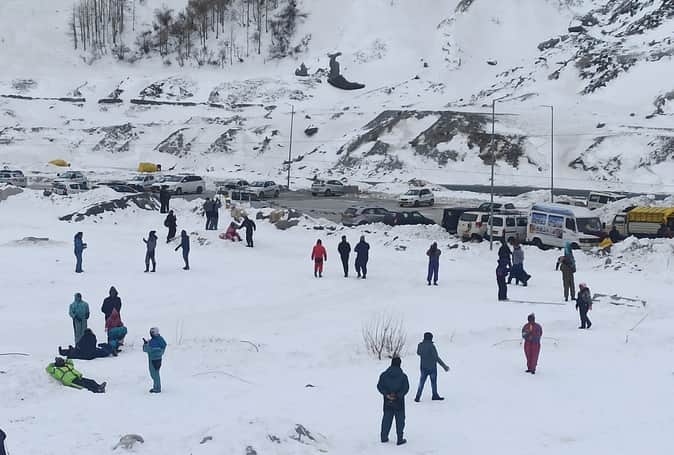 अटल टनल रोहतांग के साथ सटे गुफा होटल के समीप बर्फ के बीच मस्ती करते सैलानी।