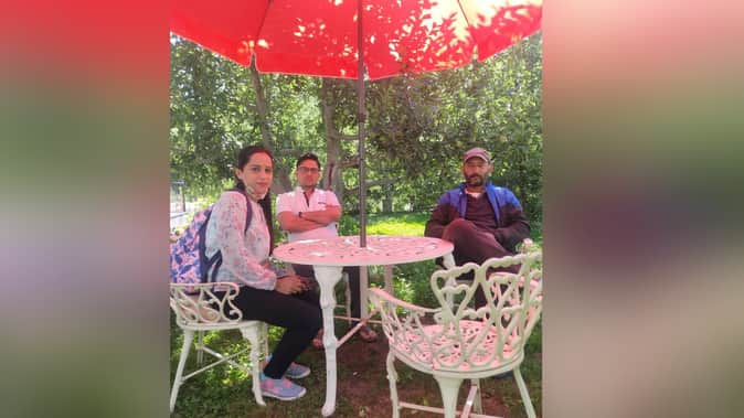 किन्नौर की सांगला वैली के होटल में लगे सेब के बगीचे में बैठे सैलानी।