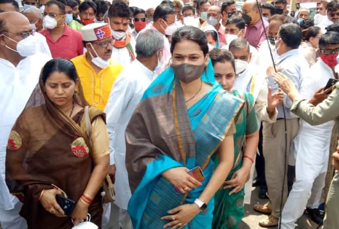 आगरा कलक्ट्रेट में नामांकन करने जातीं भाजपा प्रत्याशी मंजू भदौरिया (नीली साड़ी)