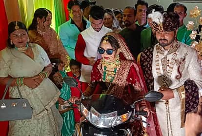 शादी में दुल्हन की ग्रैंड एंट्री: दूल्हे को स्कूटी पर बैठाकर पहुंची मंडप, लोगों ने की फूलों की बारिश