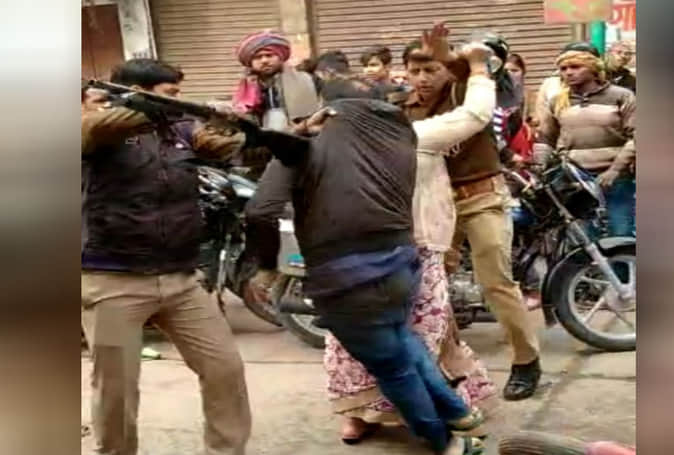 मारपीट के दौरान पुलिसकर्मी व युवक बीचबचाव करतीं महिला